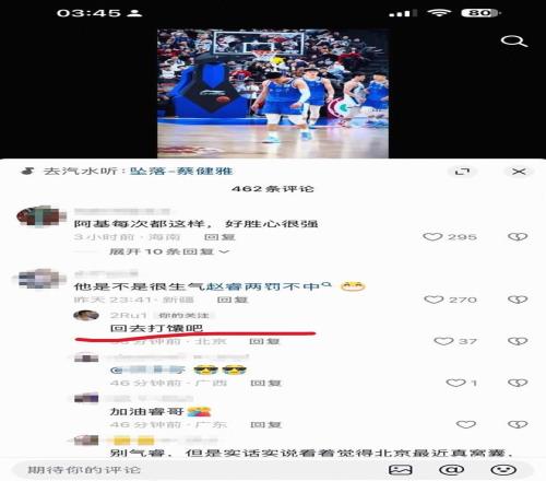 赛后,在社交媒体上出现了批评北京和赵睿的内容,据网传图片显示,北京后卫赵睿现身评论区,回复了两名IP属地新疆的球迷。